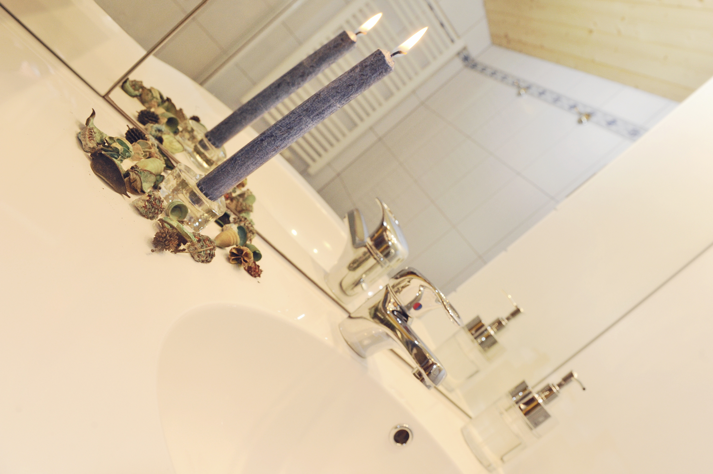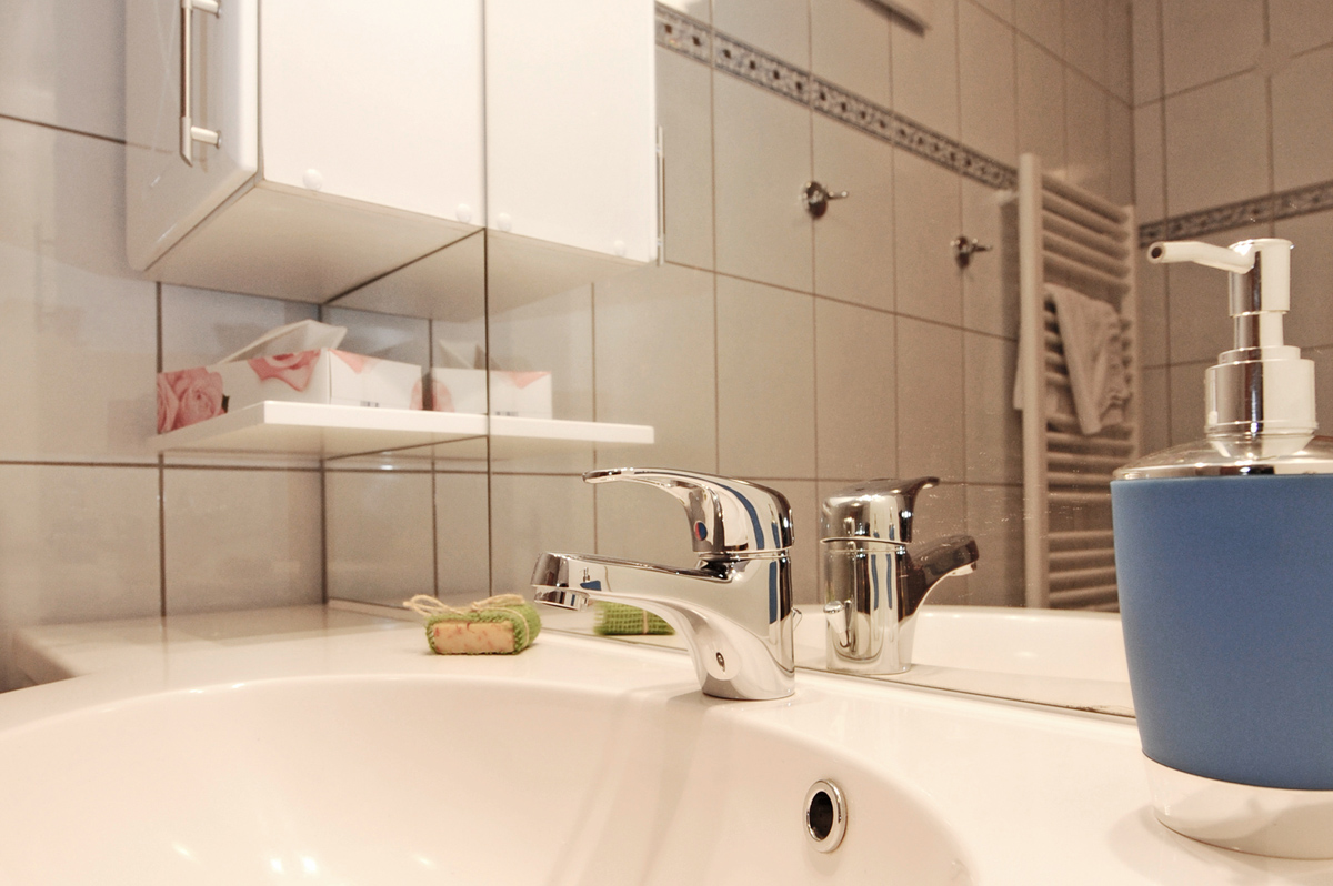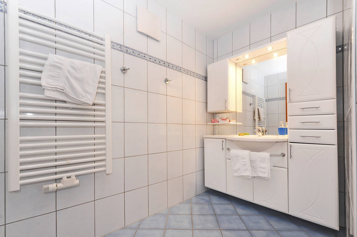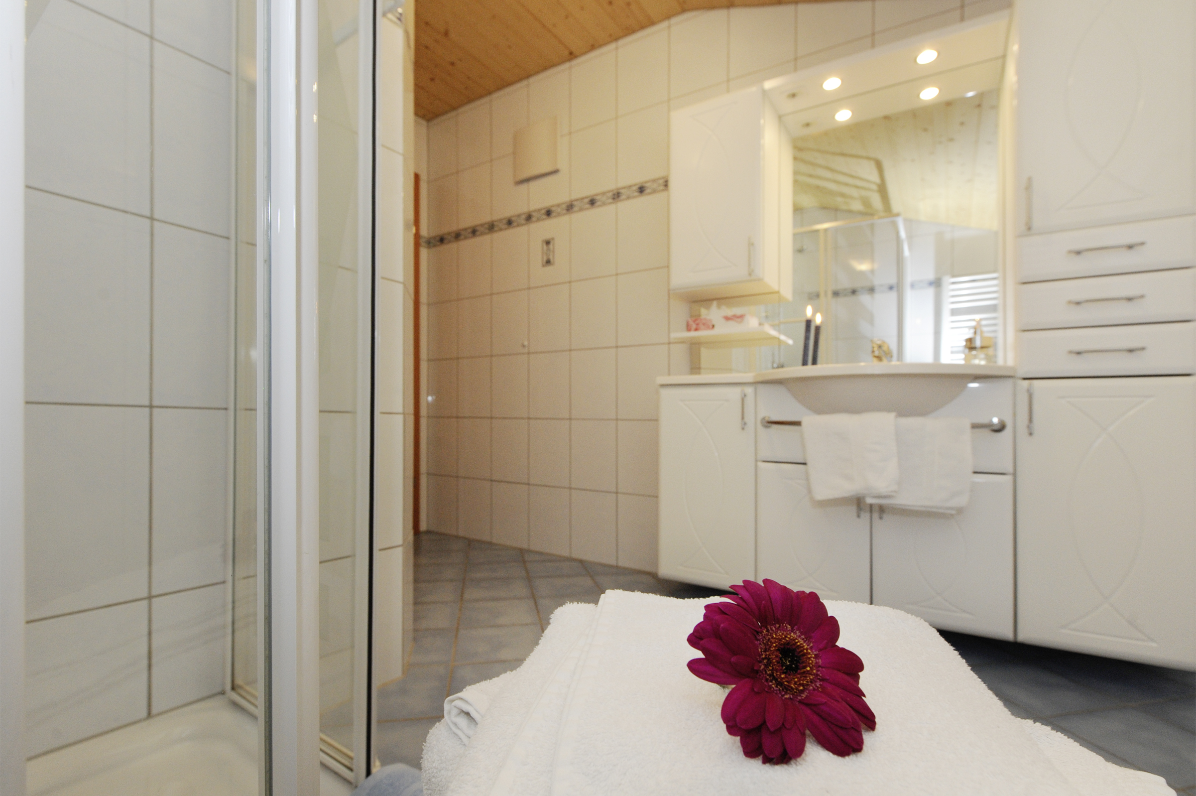 mit Dusche. Hand- und Duschtücher vorhanden.