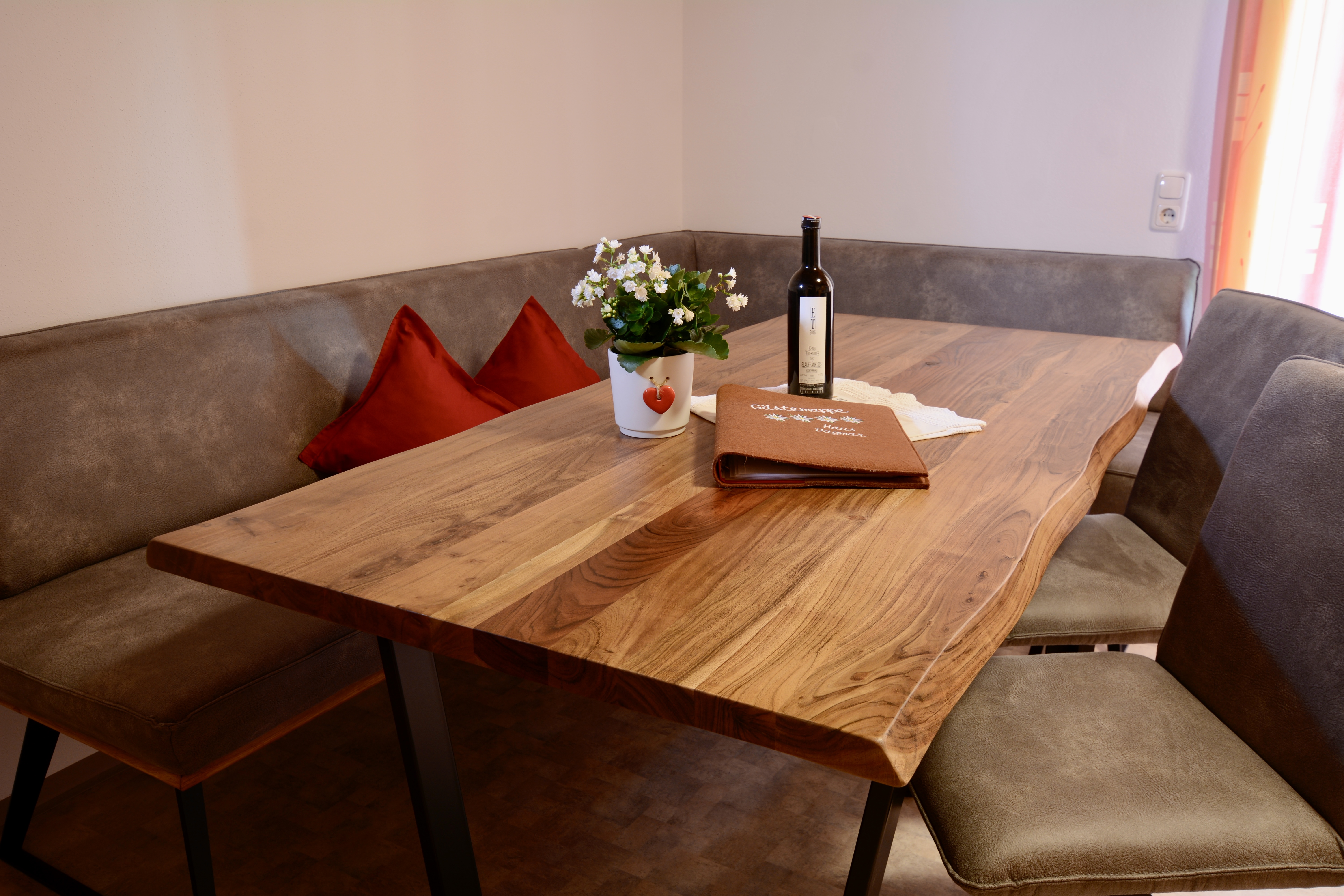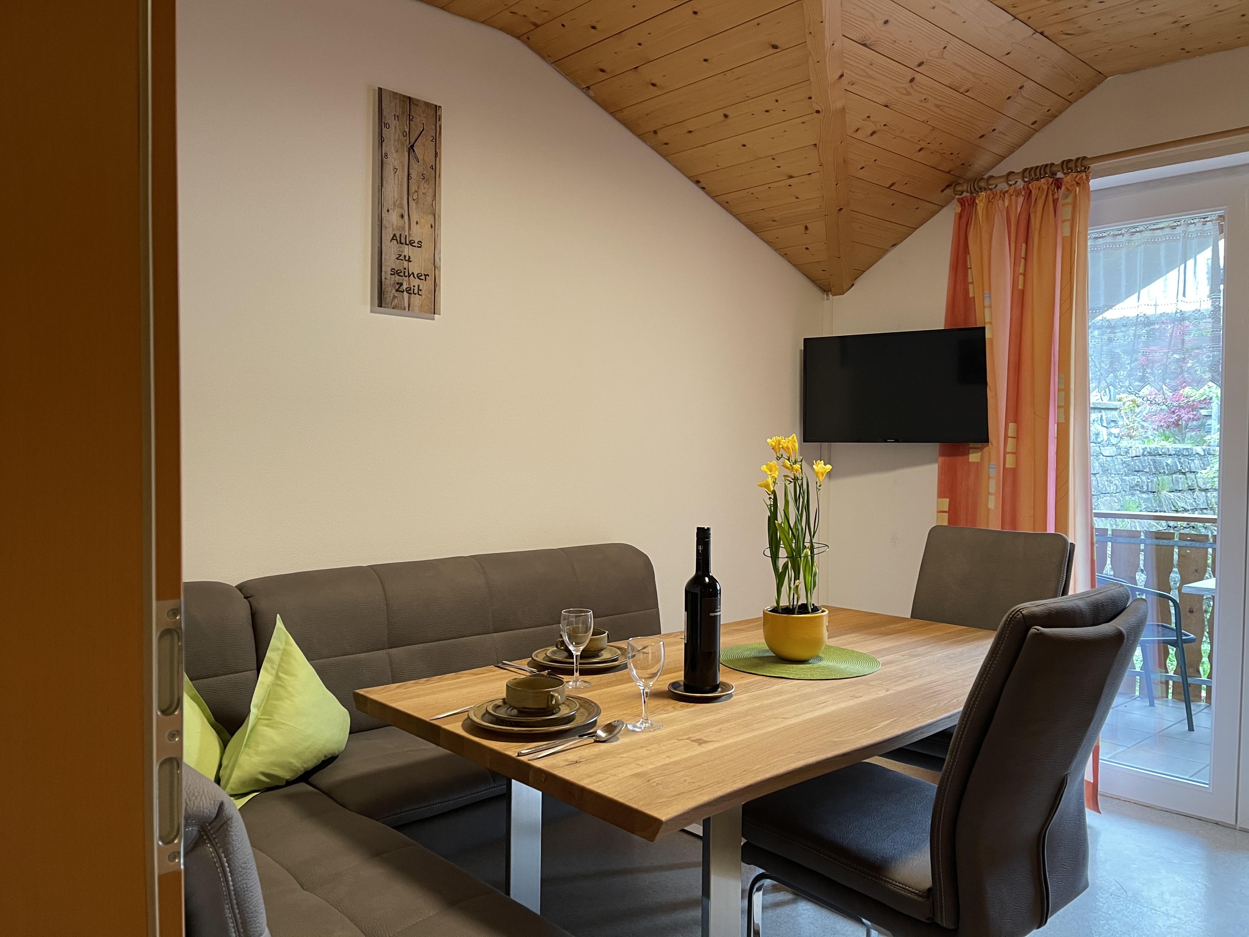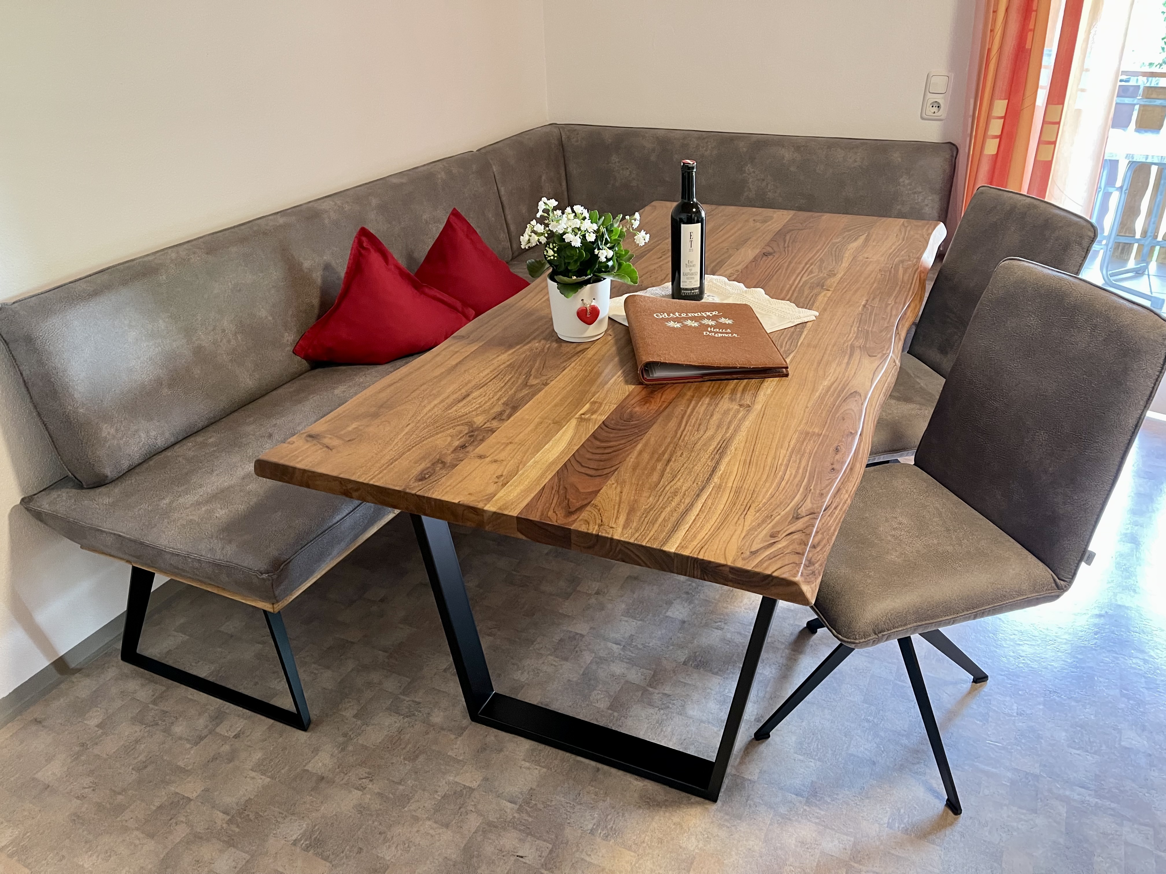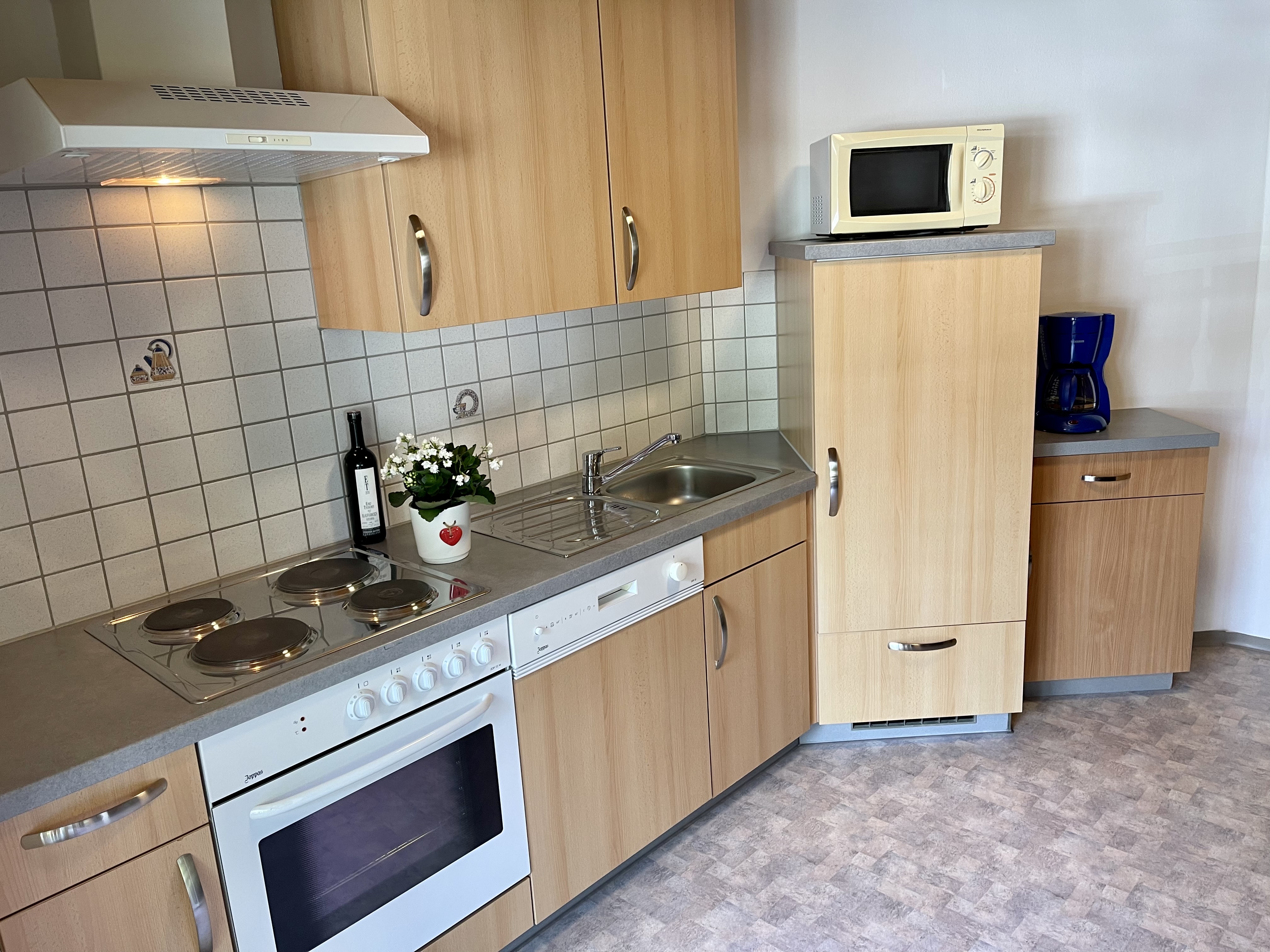 gemütliche Sitzecke, Flat-Sat-TV, Herd mit Backrohr, Geschirrspülmaschine, Kühlschrank mit Tiefkühlfach, Kaffeemaschine, Wasserkocher und Toaster. Spülmittel , Geschirrspültabs und Geschirrtücher sind vorhanden.